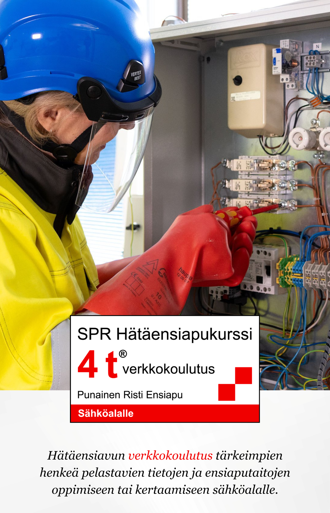 SPR Hätäensiapukurssi 4 t® verkkokoulutuksen tavoitteena on lisätä auttamisrohkeutta henkeä uhkaavissa tilanteissa. Kurssi sisältää sähkötyöturvallisuusstandardin SFS 6002:2025 mukaiset hätäensiavun aiheet.